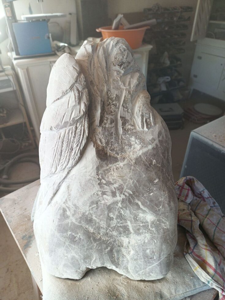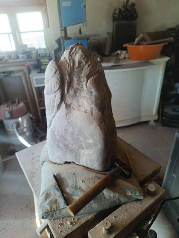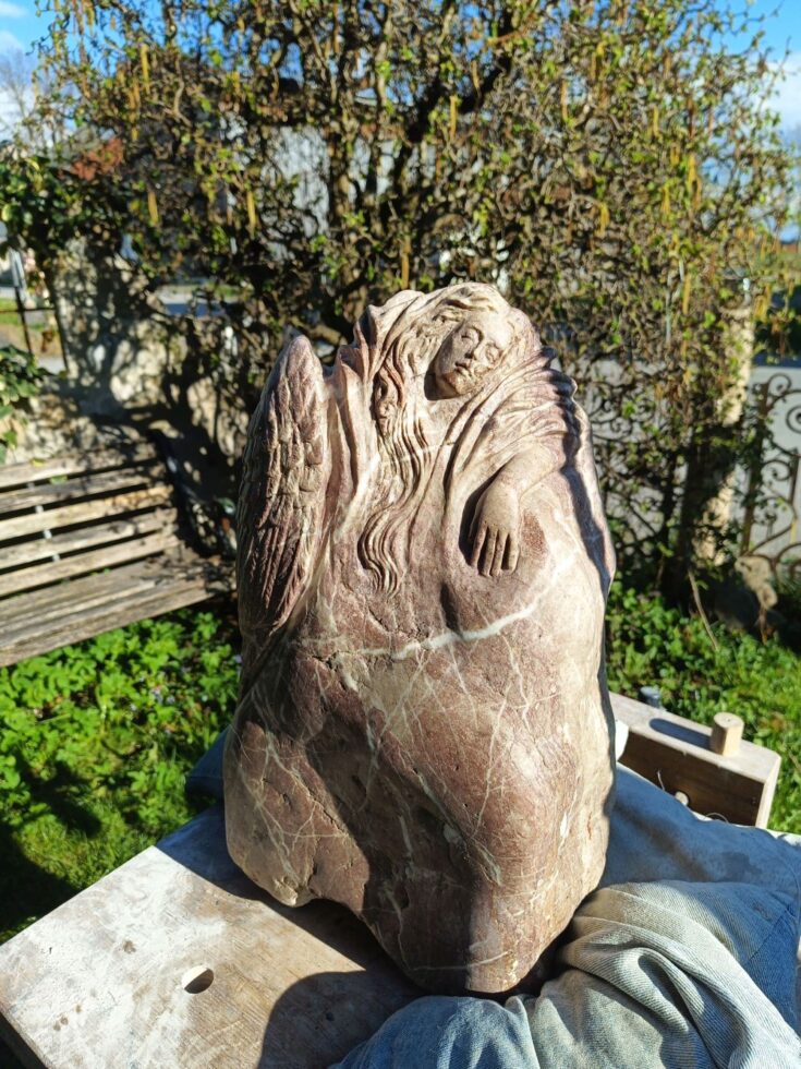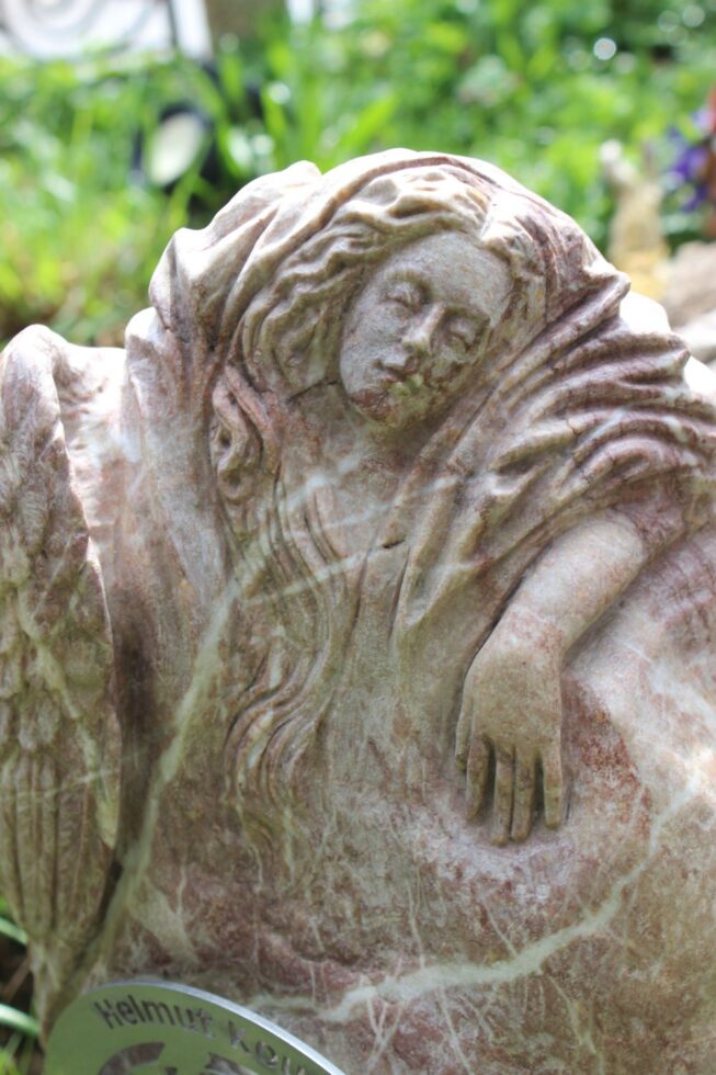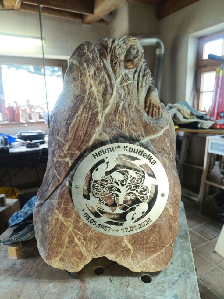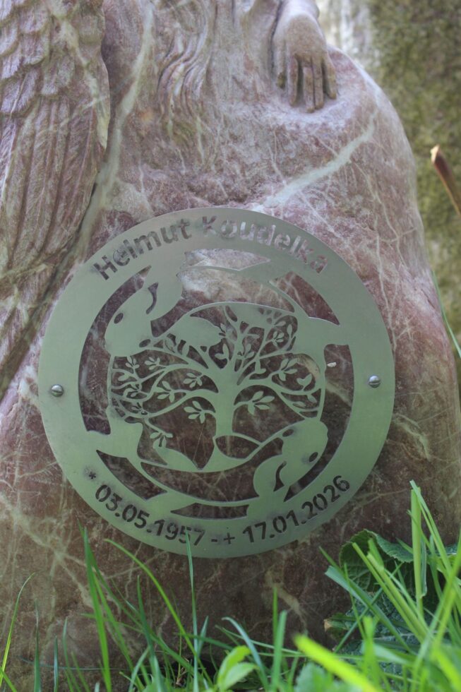 „So, der kleine Grabstein ist fertig. Es fing alles mit einem Fundstück an, das nach fast nichts aussah. Erst als ich den Stein nass gemacht hatte, kam seine eigentliche Farbe zum Vorschein. Zuerst plante ich nur, ihn zu polieren, sah dann aber einen Flügel – und aus diesem Flügel wurde schließlich ein schlafender Engel. Es folgten viele Stunden des Schleifens, bis es geschafft war. Nebenher habe ich noch die Inschrift in Stahl lasern lassen. Nächste Woche kommt der Stein auf Helmuts Grab. Ich denke, er hätte sich sehr darüber gefreut.“