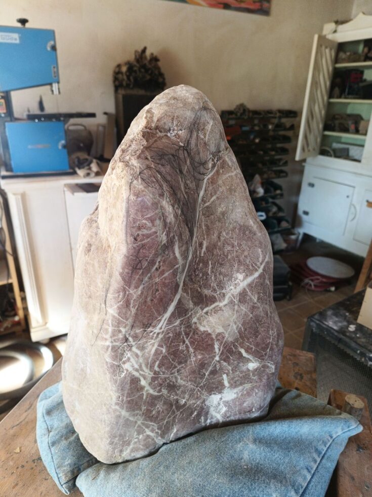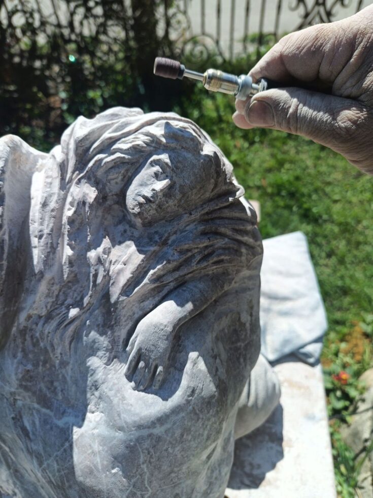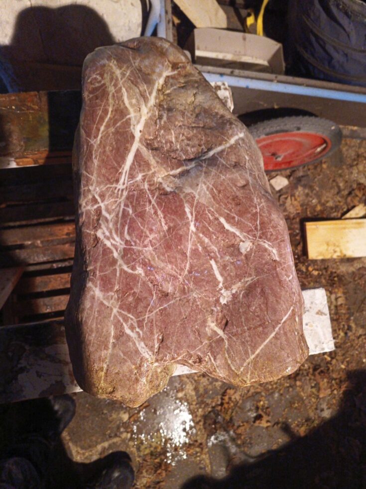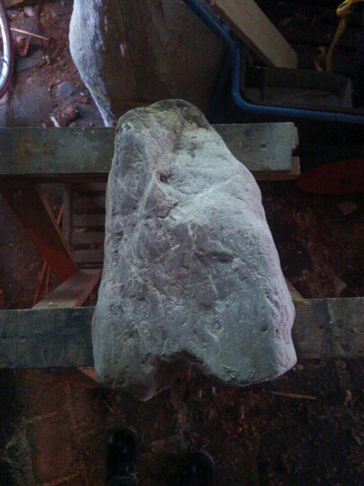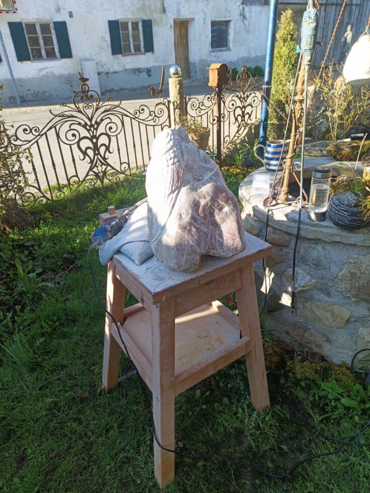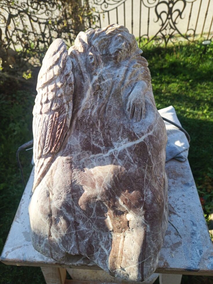 „So, der kleine Grabstein ist fertig. Es fing alles mit einem Fundstück an, das nach fast nichts aussah. Erst als ich den Stein nass gemacht hatte, kam seine eigentliche Farbe zum Vorschein. Zuerst plante ich nur, ihn zu polieren, sah dann aber einen Flügel – und aus diesem Flügel wurde schließlich ein schlafender Engel. Es folgten viele Stunden des Schleifens, bis es geschafft war. Nebenher habe ich noch die Inschrift in Stahl lasern lassen. Nächste Woche kommt der Stein auf Helmuts Grab. Ich denke, er hätte sich sehr darüber gefreut.“