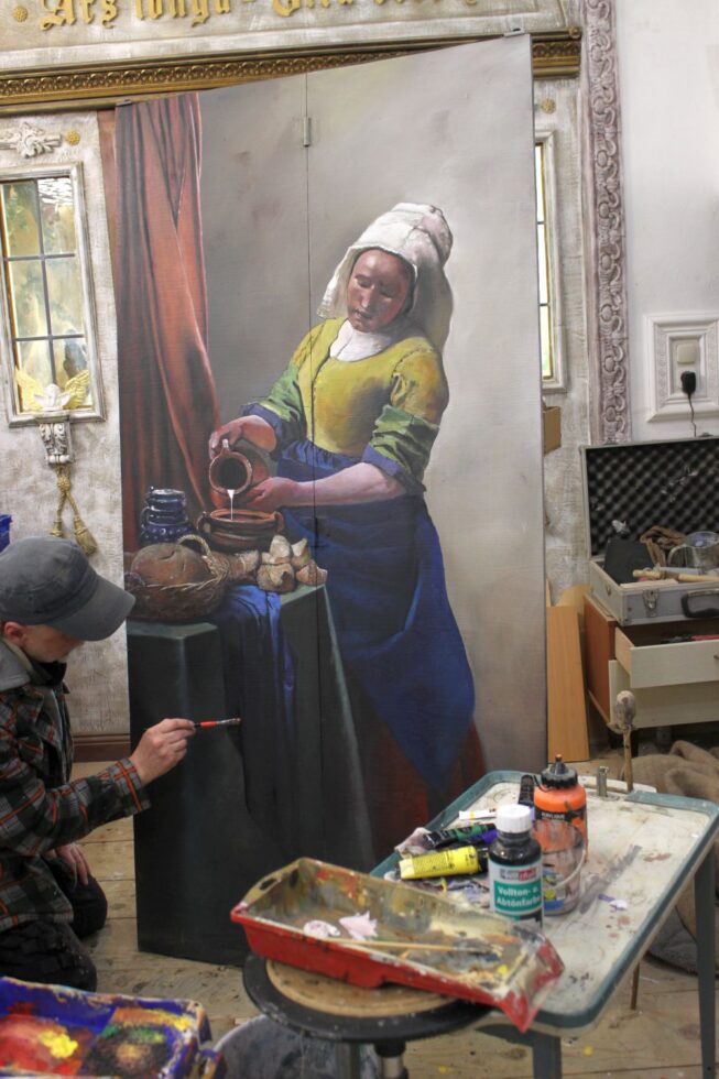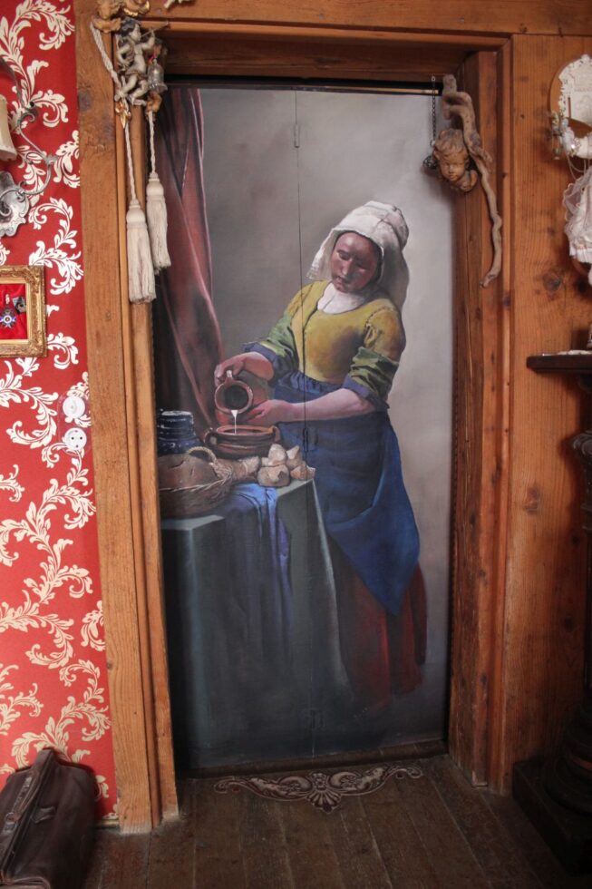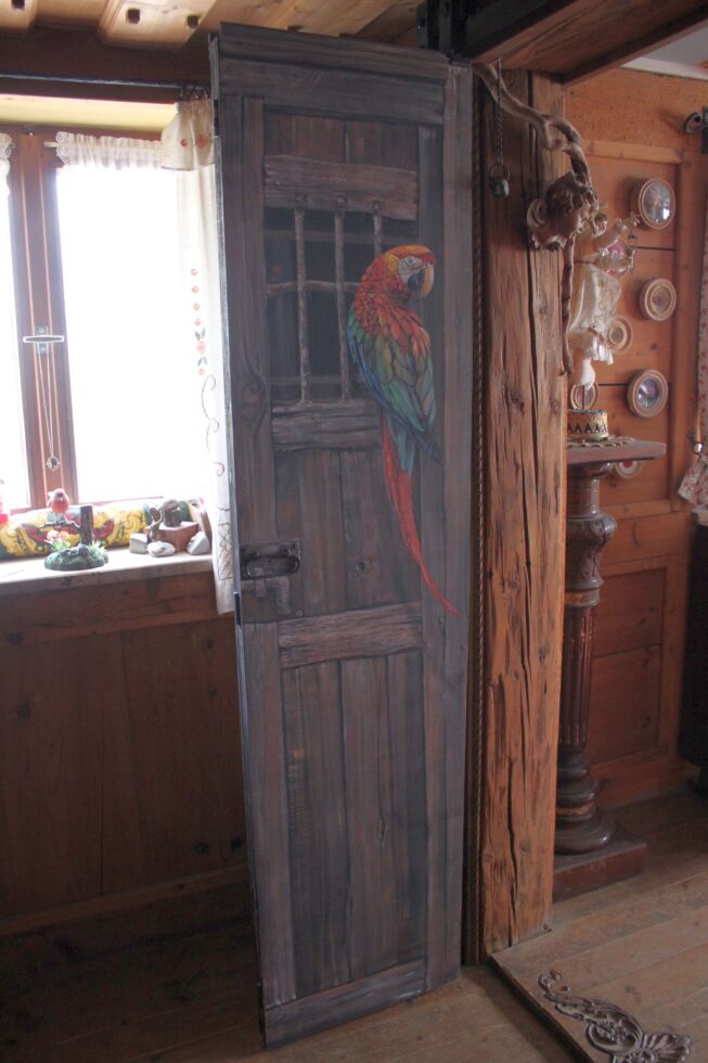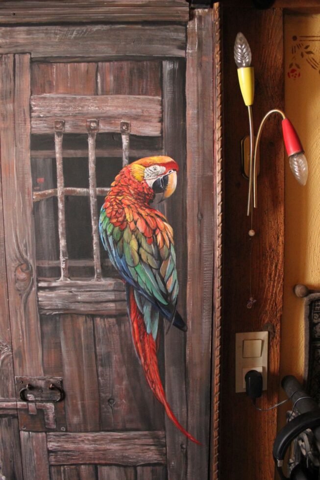 Ein Durchgang sollte mit einer Tür geschlossen werden. Eine normale Tür ging aus Platzgründen nicht. Also habe ich mich für eine Schiebetür entschieden. Eine Illusionsmalerei sollte die Wertigkeit dieser Arbeit wertvoller und interessanter machen. Da das Esszimmer urig gestaltet ist, habe ich mich für diese alte Tür entschieden. Als Farbklecks kam der Papagei hinzu, der auch gut zu der Lampe daneben passte. Auf der anderen Seite, die zum Wohnzimmer führt, habe ich ein Gemälde von Johannes Vermeer kopiert.